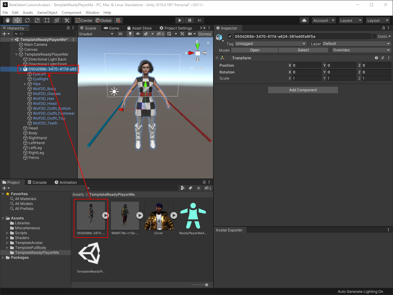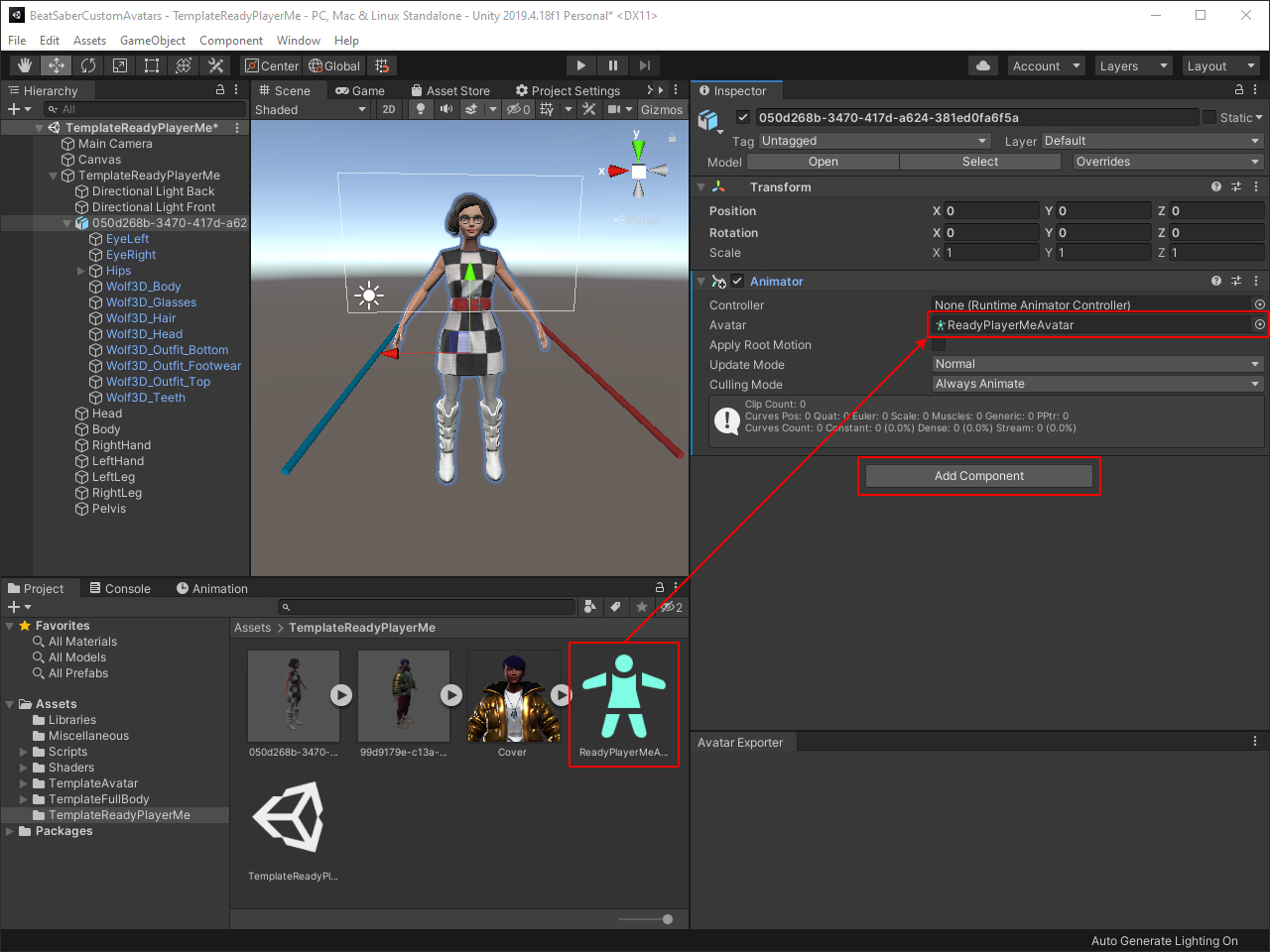 Then drag the ReadyPlayerMeAvatar from the Project panel into the Avatar section of the newly added Animator component. The next two components take advantage of the Animator component, so make sure you get it set up first.